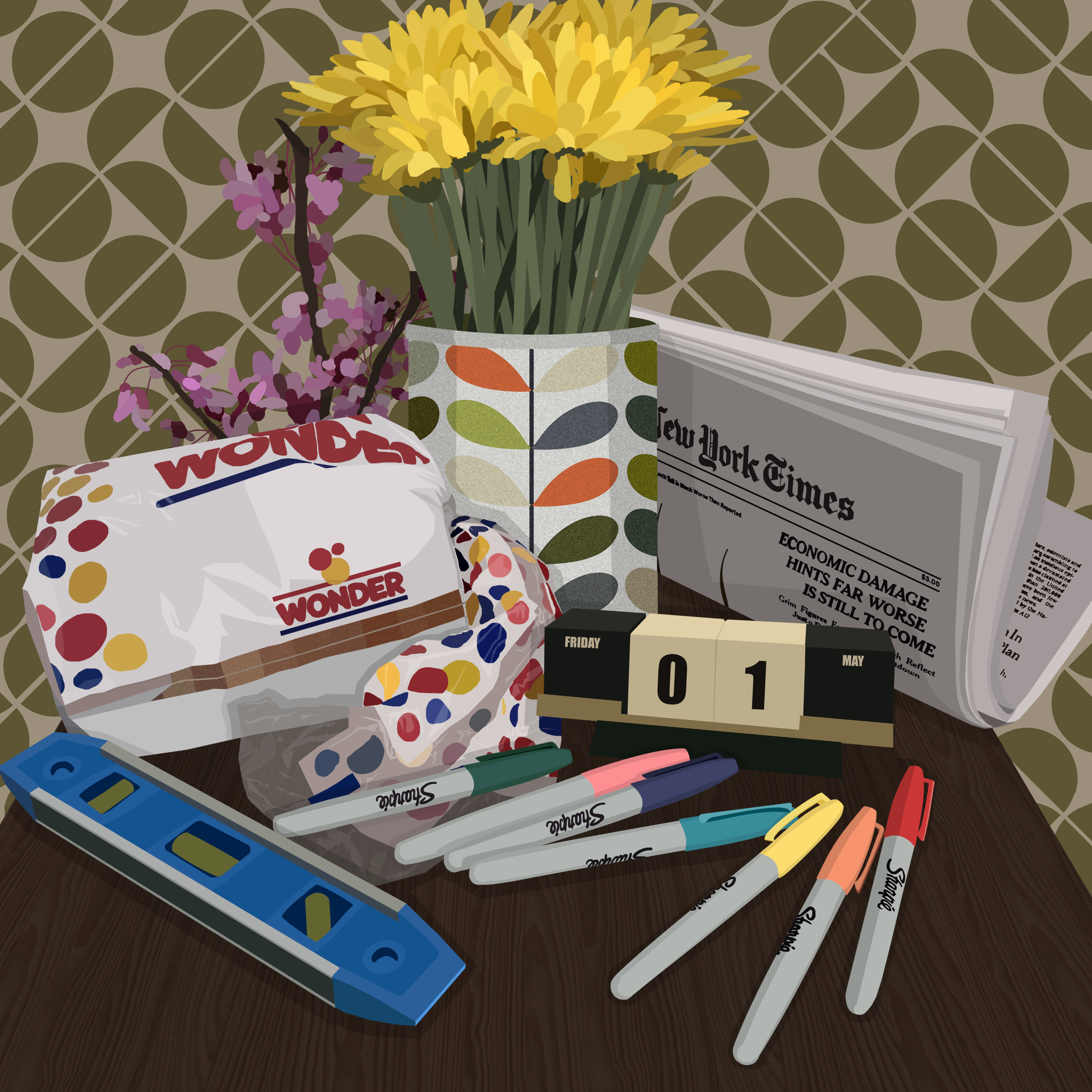 During the beginning days and months of the COVID-19 pandemic, I became much more aware of my own mortality and the ephemeral nature of my surroundings. As I spent more time reflecting at home and as items became scarce, I questioned the value I placed on objects and came to terms with the inevitable transition to a new way of life. Through this series of digital illustrations, I explored the tradition of vanitas still-life painting. Each image contains symbolic items pertaining to anxiety, time, death, life, cleanliness, play, boredom, chaos, monotony, and hope. Through these images, I filter this ongoing experience with the acceptance of change and an urgency to find joy in the present.